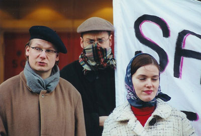 Frank Tönsmann, Stephan Ertl and Marion Korb demonstrating for Filmclub 813
